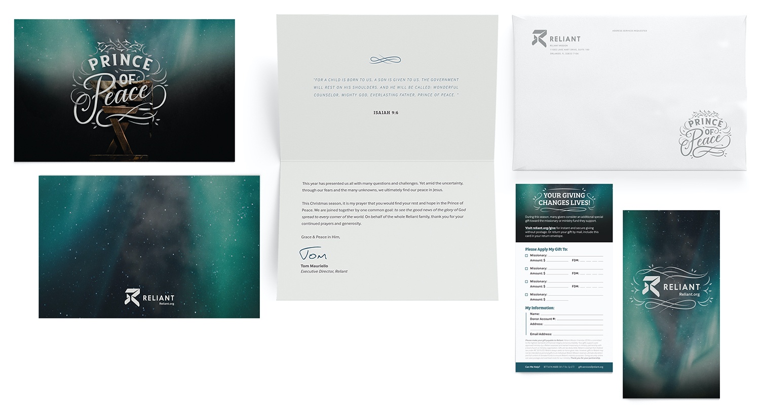 We are also mailing our annual Reliant Christmas card and end-of-year giving appeal to your financial supporters in the U.S. this week. For most, it will arrive by December 9th. We know December is a time where many partners give special or additional gifts, making it the largest giving month of the year and a time for many staff to catch up on MTD or prepare for financial needs in the coming year. In a season where we celebrate the Father sending the Son, we're praying that God's people will give generously to the work of sending people out on mission! Our theme for the card and appeal this year is "Prince of Peace." Given how difficult 2020 has been for many, we wanted to focus on Isaiah 9:6 for this year's Christmas card and appeal. You can see a mockup of all of the pieces below.