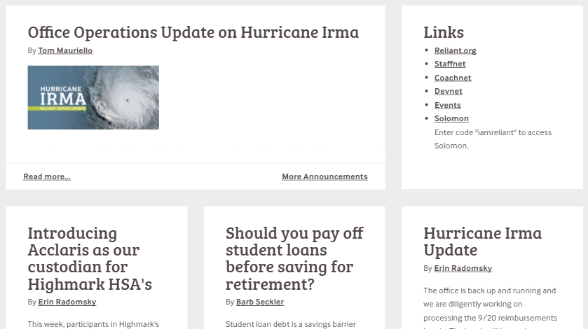 - Updated Home page, which includes news and announcements feeds from the Reliant Office