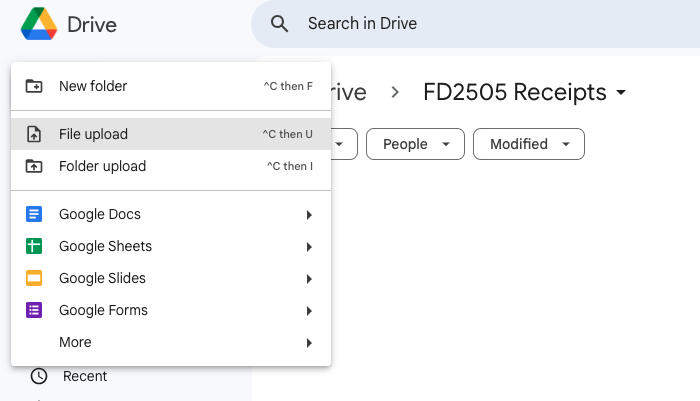 - With your Receipt folder open, Click + New and choose "File Upload". Select the completed Stipend Receipt from your computer files.