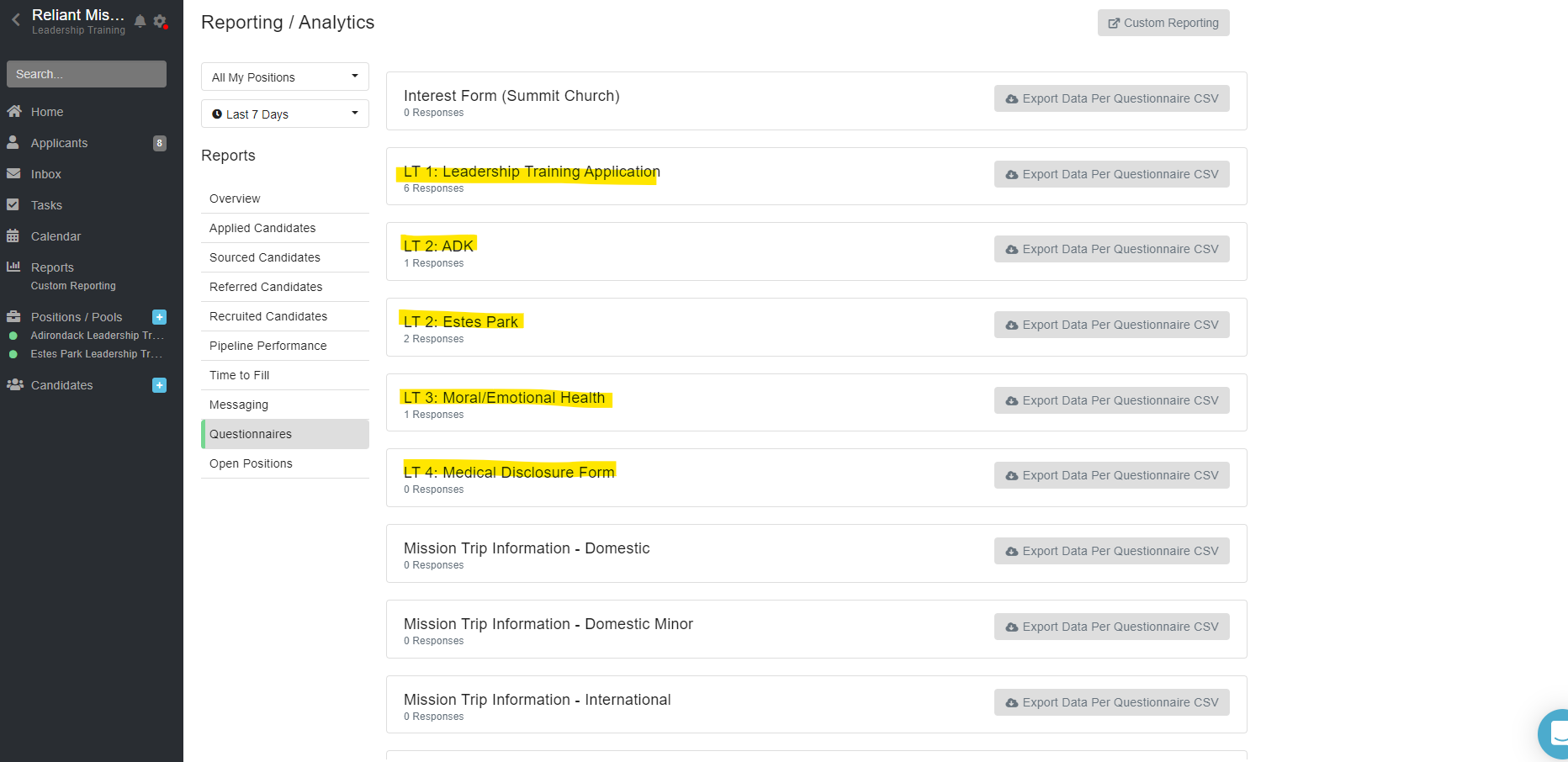 Downloading Breezy reports can be helpful to share information with LT leaders to know who has applied, from which school, and to know what stage they are in on the assessment. The reports will download into an Excel spreadsheet (CSV). You can then upload the results of that sheet into Google Sheets if you'd like to share them with all of the campus leaders attending your LT.
