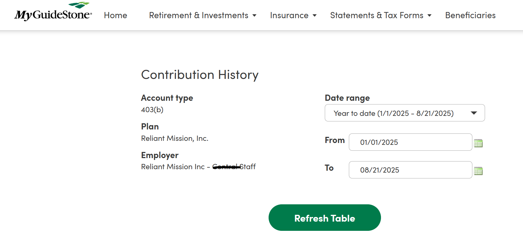 You can also access Contributions by going to: Retirements & Investments> Contributions> Contributions History. The next screen allows you to enter a date range you want to view for your Contribution History.