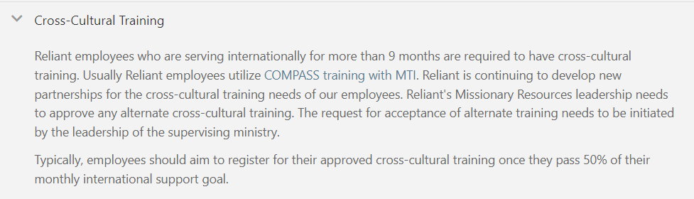 Because of the intensity of cross-cultural ministry overseas, current employees who are transferring from a US role will need to complete a few additional application and training requirements as part of their transfer to international ministry. If you are considering this type of transfer, please initiate conversations at least 6 months before your desired launch.