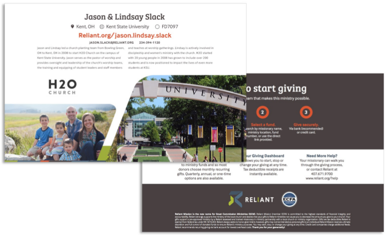 We don't all work with the same ministries, and we know that donors need to have your local ministry and church front and center. The Missionary Profile Card is a core MTD piece designed to be left at every MTD appointment. Part leaving piece + calling card + How to Give brochure, you upload your own photos to this item.
