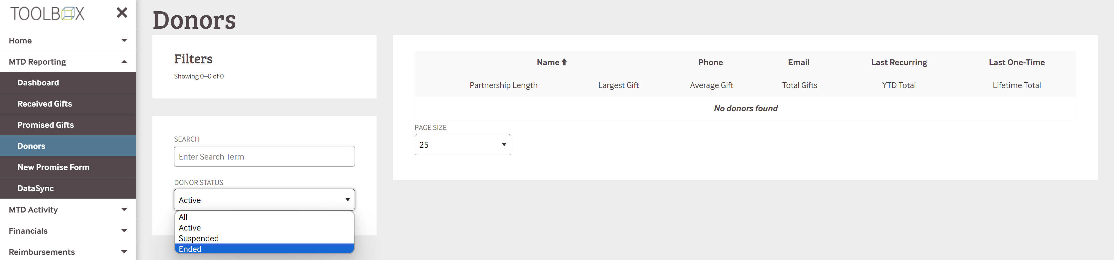 Scroll down and select "Donors". This will pull up a list of your donors. The basic settings are set on "Active" donors, but you can select "Suspended," "Ended," or "All" to see other categories of donors.