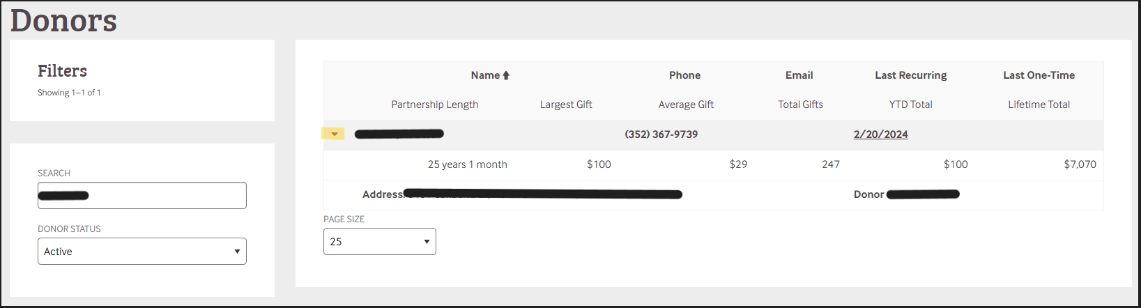 To see an individual donor's overall giving history, click on the caret next to their name: