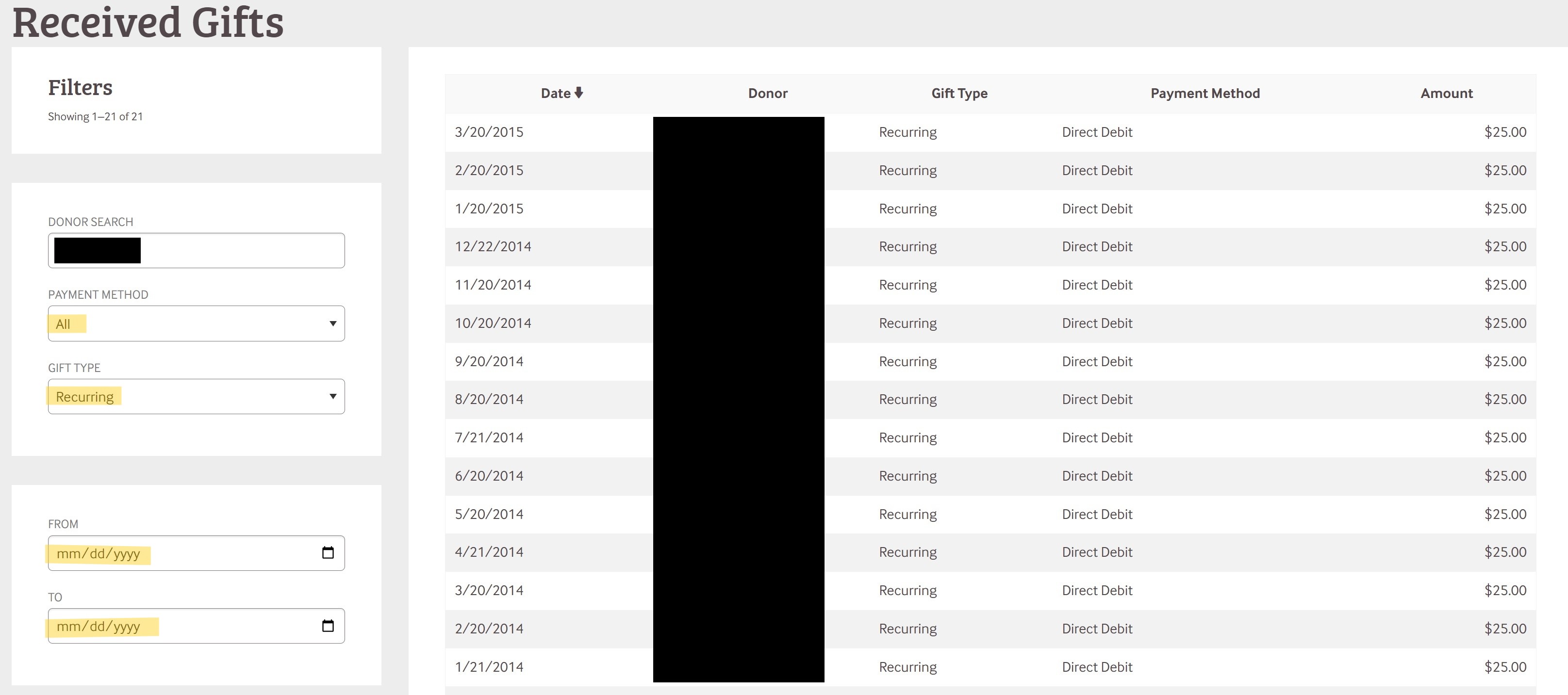 Within that individual donor's data, you can also filter on the left by Payment Method (Direct Debit, Credit Card, Check), gift type (Recurring or One-Time), and filter to understand your partner's giving tendencies, look for special gifts, or to understand better which payment methods the donor uses.
