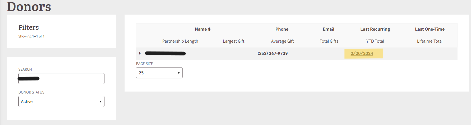 You can dive in further by clicking on the date of the Last Recurring or Last One-Time gift. This will show you all the ongoing and one-time gifts from a specific donor with the date on the left and the amount on the right. This is a great way to see if an individual has changed their giving.