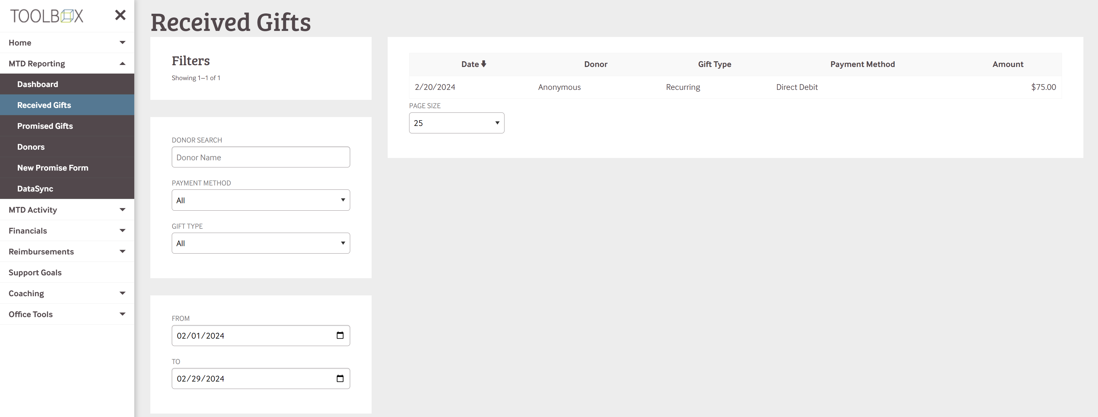 This will autofill ALL of your previous gifts. To see gifts in a specific timeframe, you can filter to see during a certain timeframe (See below for February 2024).