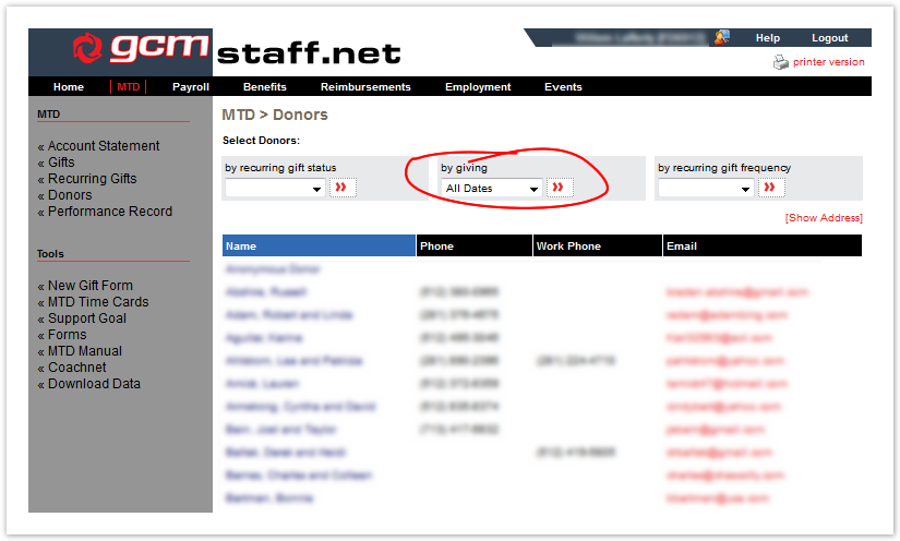 You can then use this listhead to http://www.gcmstaff.net and go to MTD > Donors. From the donors page select "All Dates" in the "By Giving" drop down box. This will then give you a list of all donors who have ever given to the account you are responsible for.