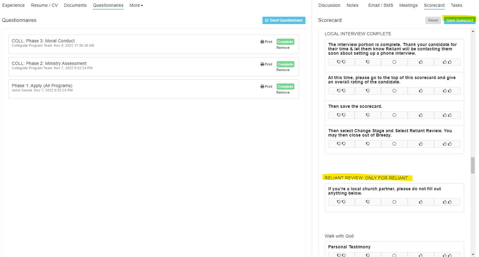 Once the references are submitted, and we have given the application a quick look over, we will send the application off to Local Church Interview. You will receive an email (Subject: You've been assigned a task - Reliant Mission) with a task to complete. It will come from Breezy and it will look like this: The email will not say who the applicant is. It will only display the Task name Name and the due dateDue Date. From here, you can click Review Task. Once you click Review Task, it will open the window with all Tasks assigned to you. You will want to click View Candidate to see who was assigned to you. Once you click View Candidate in the Task View, you will see the Candidate profile (below). When you get here, you will want to click Questionnaires at the top (highlighted). After you click Questionnaires, you will see all of the Questionnaires the applicant was sent and what they completed's completed Questionnaires. To view their answers, you will need to click on one of the Questionnaires in the list. This will then pop out the questions they were asked along with their answers. As you view your applicant's responses, you may find it helpful to use the Notes tab to note any concerns or red flags that you see. You will also want to view the references that were submitted. To do so, click over More and then select References. Once you click references, you should see 3 references. You can click on a reference name to view the submitted reference. When you're ready to do your interview with the applicant, you will need to use the scorecard Scorecard. The scorecard will guide you through the interview process. At the top of the scorecard the scorecard is a space for your overall thoughts - you will complete this at the close of the interview. To begin, you will start with the Confidentiality the Confidentiality Agreement. For each question, you will have a rating scale of thumbs (optional to use) as well as a space to add additional comments or responses from the applicant. About 3/4 way through the scorecard, you will see "RELIANT REVIEW: ONLY FOR RELIANT" - at this time, you will want to scroll back to the top of the scorecard and fill in your overall thoughts in the "Thoughts on this Candidate?" box as well as give an Overall Rating. After you give your overall rating at the top of the scorecard, your portion is complete, and you will click the blue Save Scorecard button (do not forget this step!). Your last and final step (after saving your scorecard) will be to assign the applicant back to Reliant. To do this, you will click, Change Stage in the top right corner and click Reliant Review. A message will appear at the bottom in green that says "Stage updated" Once you see that, you can close out of the applicant or out of Breezy entirely. You're doneview. The last thing you will want to do is mark the task as complete. If you skip this step, Breezy may continue to email you notifying that this task is due. To avoid this, simply go to the Breezy home page, click on Tasks on the left side, and check the task as done. Once you have done that, you are finished with the local/church interview stage! |