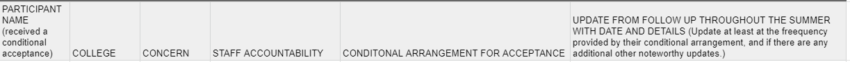 Reliant will create a Google Sheet for shepherding the concerned participants (separate for each program) that lists the name of all participants that have been conditionally accepted that will be edited by the local event director and will be viewed by Reliant and in the case of Collegiate LTs it will also be viewed by an NEB member.
