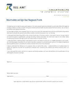 Next steps for opting out of Reliant coverage first confirm that they are eligible for host country national health coverage, enroll and receive proof of coverage. (Often this involves a page being added in a passport, or other identification cards.) Send the following to Reliant (email these to: international@reliant.org) Until final Reliant approval is given for opting out, the employee will continue to be covered under Reliant’s International Health Plan. International Opt Out Request Form