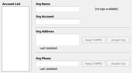 - Once you have run the DataSync and a contact has been connected with a donor you will then see the GCM's donor number (RE######) their instead of "No Org Account" [Figure #a]. After a DataSync IF there are updates from GCM to a Donor's data TntMPD will display the updateable data in red [Figure #b & c]. Any data from GCM that has not changed will display in TntMPD's normal black/blue colors [Figure #d]. When you click on GCM's Donor Number (RE######) [Figure #a] a window will popup showing the Donor data from GCM [Figure #]. For new data from GCM, TntMPD will enable the buttons on this screen [Figure #a]. If GCM's data has not changed, these buttons will be disabled [Figure #b]. If you click "Accept GCM" then TndMPD will update the contact's data with the data from GCM. If you click "Keep TntMPD", it will disregard the data from GCM. Once you have clicked "Keep TntMPD" or "Accept GCM" TntMPD will not show any data to update until a Donor actually updates there data with GCM. This means that after clicking one of these buttons, even if you change a donor's data within TntMPD and try to update it with GCM's data, TntMPD will not activate these buttons again until a donor updates their data with GCM.