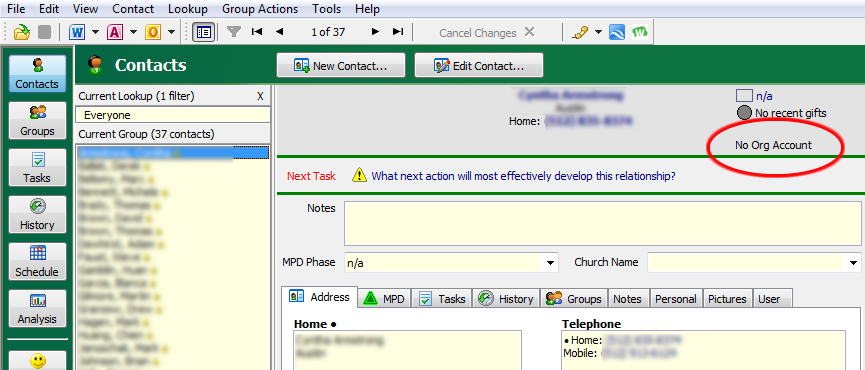 Ok, so, you're sync'ed, but what does that mean exactly? Did TntMPD just update all of your contact's contact information with GCM's data? The datasync you just completed associated your TntMPD contact with a GCM donor, and it did this using GCM's donor number (RE######). If you take a look at the top right of a contact who has not been associated with a donor, you will see "No Org Account" [Figure #]. If you click on "No Org Account" a screen with no information will popup [Figure #].