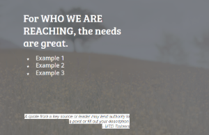 | If it’s all right with you, I’d love to show you some photos to help communicate more about <church/ministry>, Reliant Mission, and my role with them. |