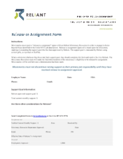 When an employee believes they have met or exceeded the above goals, according to Reliant's records, they must complete a Release to Assignment form and submit it to international@reliant.org. Reliant will then verify this information, determine if the employee is to be released to assignment, and notify the employee in accordance with the decision. Employees must continue raising support as their primary job responsibility until they have received release to assignment approval from an authorized representative of the Missionary Resources Department.